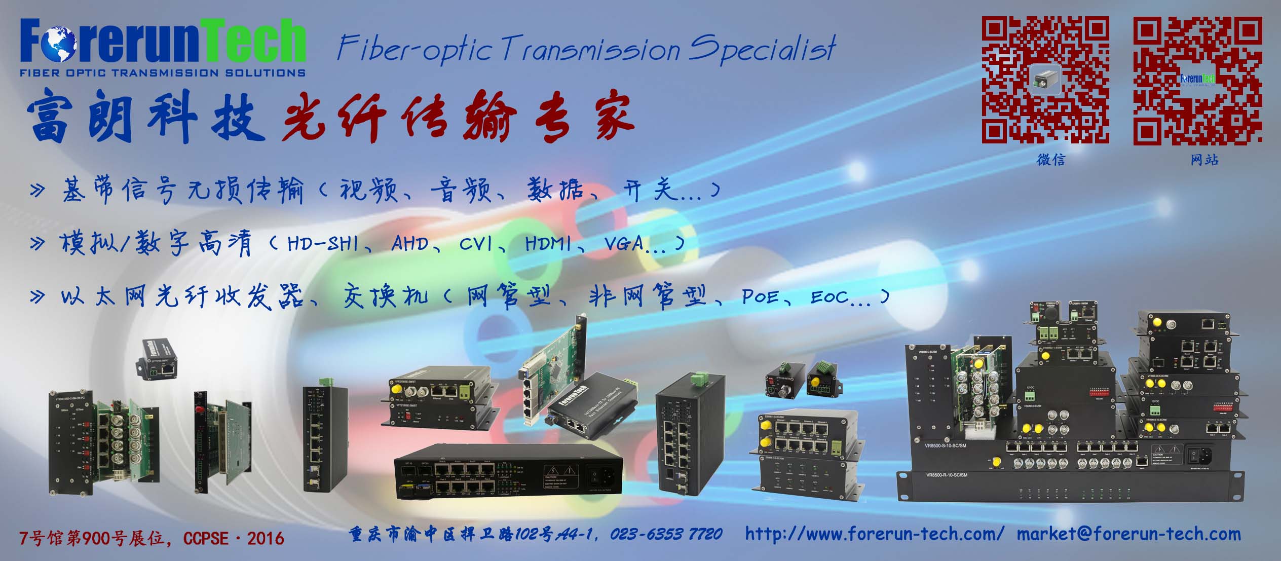 重庆富朗科技有限公司(ForerunTech)是一家从事光纤通信设备制造的专业公司,其核心团队具有十年以上从业经验,掌握当今光纤通信的核心技术。我们的产品型号众多,所有产品均为自行研制并具有自主知识产权,其主要产品线包括:基带信号无损传输系列;模拟/数 字高清视频、高保真音频系列;网管型和非网管型光纤收发器、交换机系列。所涵盖的传输信号种类繁多,至少包括视频、音频、异步通信数据、开关量、以太网、 有线电话、内部通话等工程常用信号,并采用先进技术于一芯光纤中对各种信号进行多信道、多种类的组合传输以追求光纤信道效率的最大化。我们的产品可用于各 种现场环境,其光纤链路拓扑包括点对点、级联、环形、星形、复合星形、复合多环以及复合星形加复合多环,可满足不同用户的各种需求。
